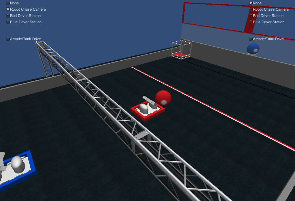- Use the radio buttons to change camera view. Up to two cameras can be viewed simultaneously. The left Robot Chase Camera will follow the red robot, the right will follow the blue robot
